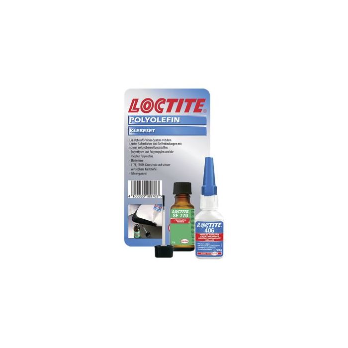 LOCTITE® 406 / LOCTITE® SF 770 is a 2-part kit for bonding polyolefins and other low-energy surfaces. LOCTITE 406 is a transparent, ethyl cyanoacrylate-based instant adhesive for plastics and elastomeric materials that require very fast fixturing. It fixes the adhering components in seconds and hardens very quickly, forming an ultra-thin bond. Its low-viscosity nature makes it highly suitable for small gaps. LOCTITE SF 770 is a low-viscosity, aliphatic amine primer for making polyolefin and other low-energy surfaces suitable for bonding with LOCTITE 406 and other LOCTITE cyanoacrylate adhesives. It's transparent to slightly hazy and fluoresces under UV light – great for quality control.
