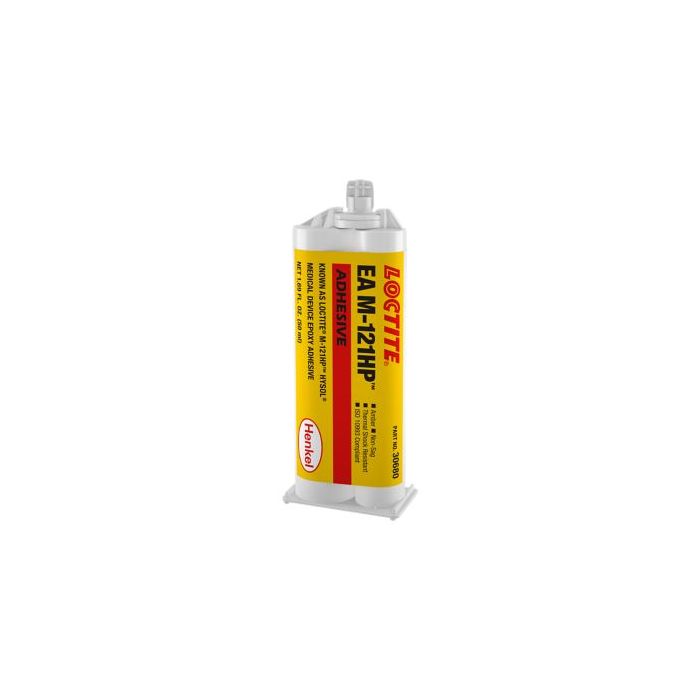 LOCTITE® EA M-121HP is an off-white to beige, 2-part, medium-viscosity, non-sagging epoxy adhesive, which is compliant for use in the assembly of disposable medical devices. It cures at room temperature and forms a tough, amber-beige bond line with excellent resistance to peel and impact forces. Works particularly well with low-stress applications that require high-impact and high-peel strength. It has excellent thermal-shock resistance and can bond a wide range of materials, including aluminium, steel and other metals, plastics and ceramics.