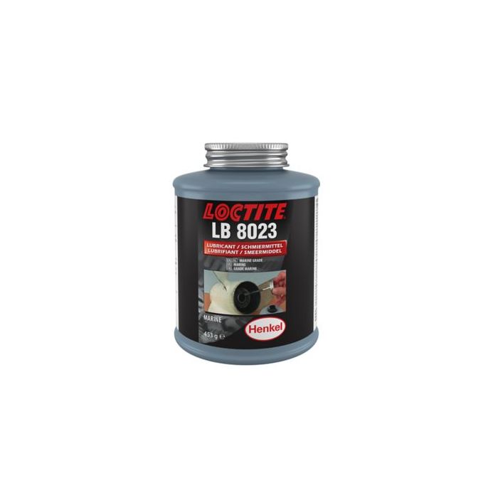 LOCTITE® LB 8023 is a black, metal-free, brush top lubricant and anti-seize made from graphite, calcium, boron nitride and rust inhibitors. ABS approved, it protects assemblies from fresh and salt water. It works especially well in high-humidity conditions. It has excellent lubricity , superior water wash-out spray resistance and prevents galvanic corrosion. High-temperature resistance to 1315°C (2399°F).