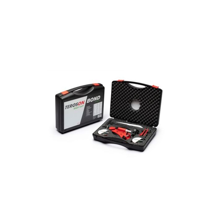 The TEROSON® BOND EASY CUT is a 1-operator toolbox with all the necessary tools to remove vehicle windscreens or other body parts. It can also cut out glued tuning parts, e.g. spoilers. The toolbox includes a piercing needle, removal cord (2 pieces), universal removal device, drive shaft and fastening hook, cutter, flexible drive shaft, cord guide lever and angular drive. Instead of a conventional metal cord, it uses a braided polyethylene cord that prevents damage to the paintwork or other body parts. It also ensures safe application as the nylon cord poses no safety risk in case of tearing. TEROSON BOND EASY CUT is part of the TEROSON® BOND Windscreen Adhesive Application System.